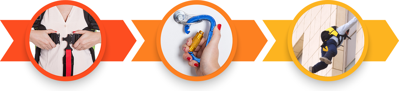 Simply follow our 3 step process: Buckle Up, Clip onto the anchor point, Exit through window or balcony.